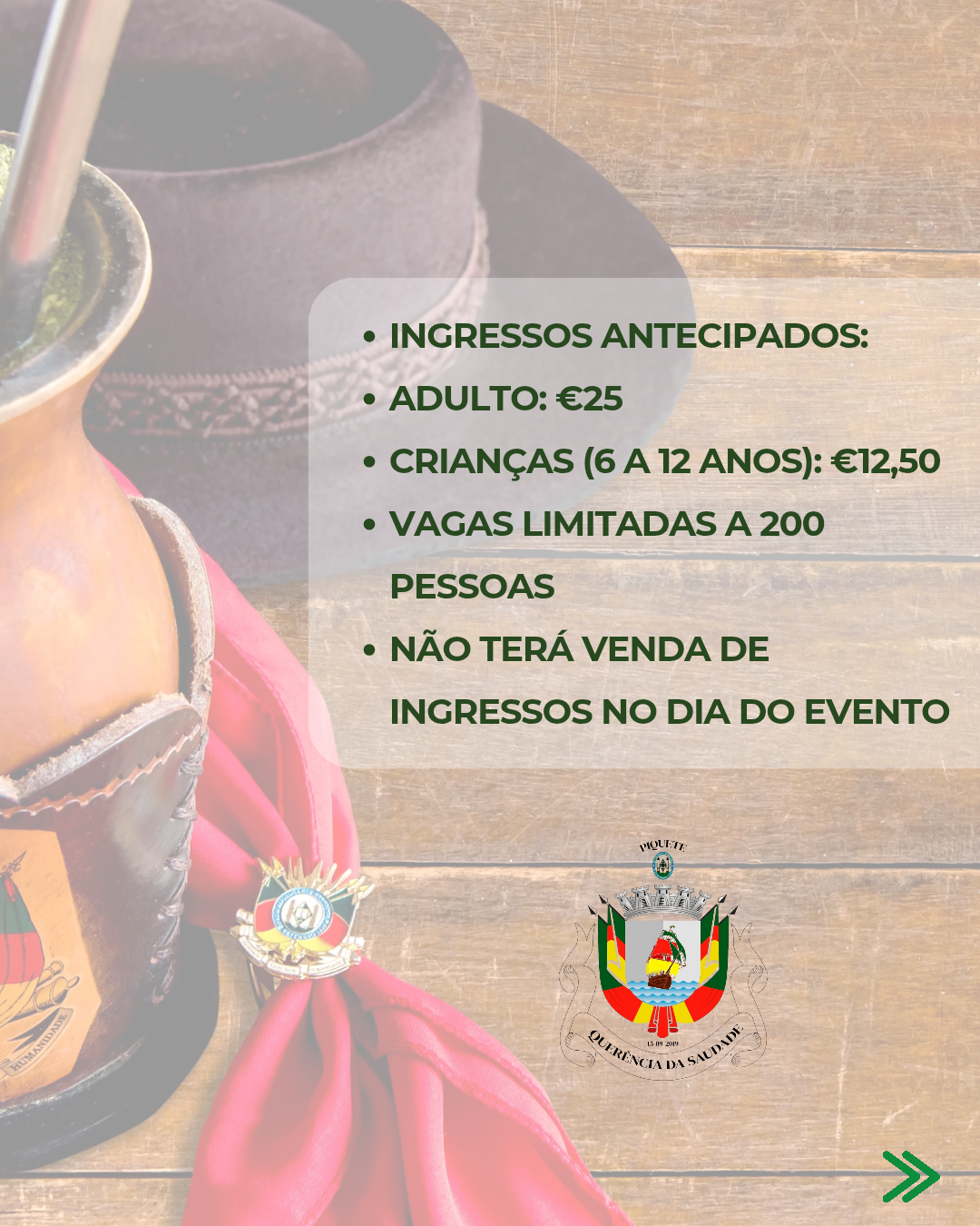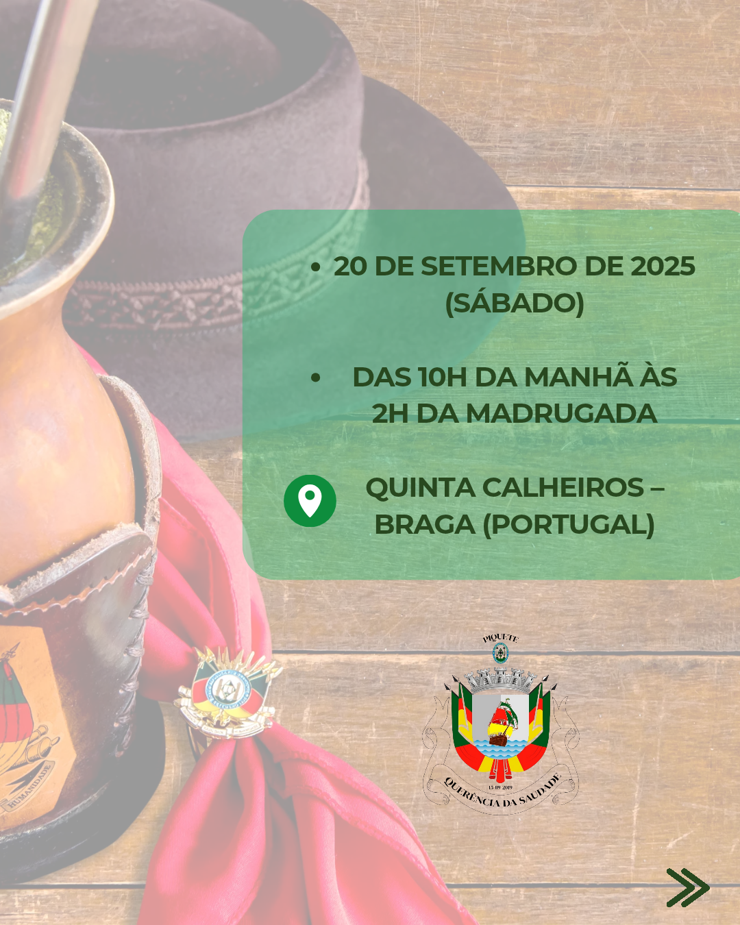 Com vontade de partilhar a cultura gaúcha com a comunidade local e com outros conterrâneos que vivem na Europa, o grupo realiza encontros e celebrações típicas. Entre os eventos planejados está o inesquecível 20 de Setembro, símbolo da Revolução Farroupilha, que será celebrado com a tradicional Costela Gaúcha 12 horas — símbolo máximo da paciência, sabor e fraternidade campeira.